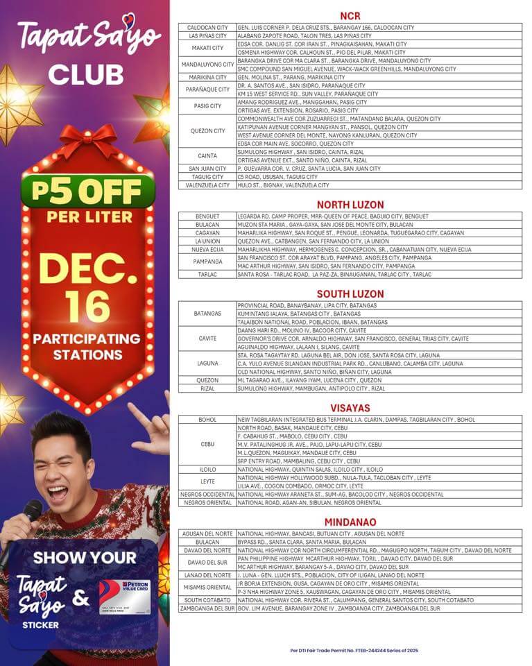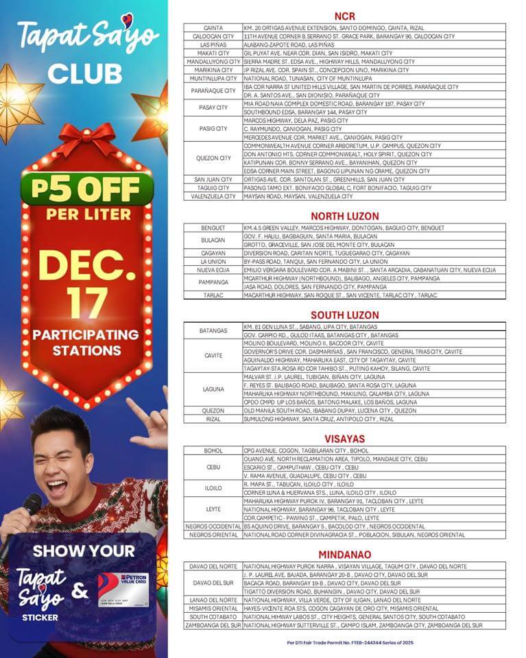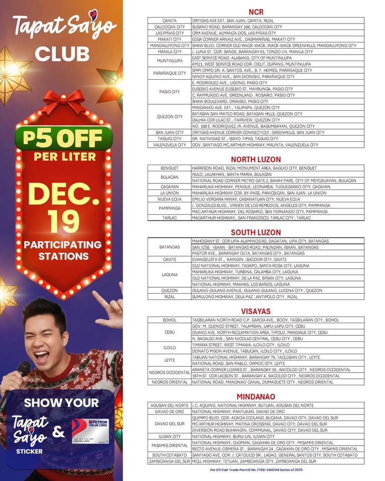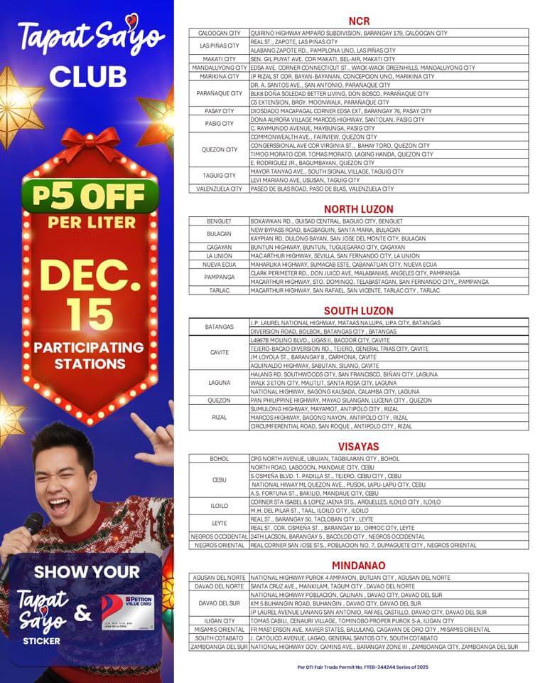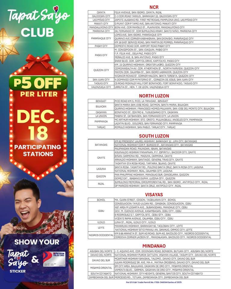 1. Promo is valid on December 15, 16, 17, 18 & 19 from 10:00AM to 1:00PM at select Petron stations nationwide. Please refer to the list of participating stations below.