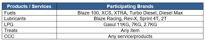 10. For fuel products, only retail transactions with fuel loaded on vehicle tanks are considered valid. Loading through containers, non-retail or purchase and bulk orders, fleet account transactions are not eligible for the promo.