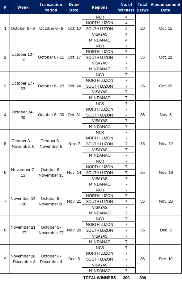 14. There will be 9 weekly draws. The weekly raffle draw will take place every Friday at 10:00 AM starting October 10, 2025, with the supervision of a DTI representative. Eligible customers’ e-raffle entries from their transactions will be accumulated, and non-winning entries will still be included in the subsequent draws. Winners will be announced the following week via social media post at Petron Rewards official Facebook page.